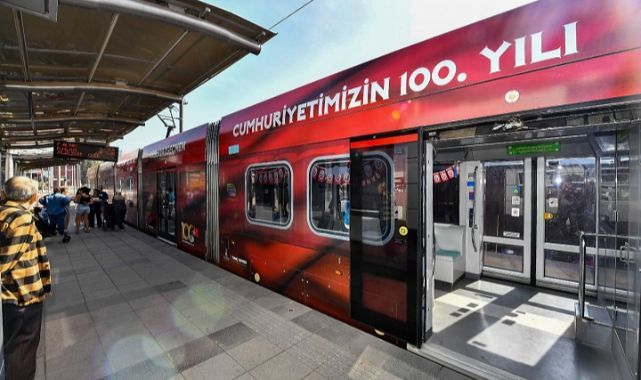 Cumhuriyet’in 100’üncü yıl kutlamaları öncesinde kenti binlerce bayrakla kırmızı beyaz renklere büründüren İzmir Büyükşehir Belediyesi, Fahrettin Altay ile Halkapınar arasında çalışan iki tramvay aracını da 100’üncü yıla yakışır bir şekilde süsledi. İzmirliler, ulu önder Mustafa Kemal Atatürk’ün fotoğrafının da bulunduğu tramvay araçlarına büyük ilgi gösterdi.İzmir Büyükşehir Belediyesi, Cumhuriyet Bayramı’nın 100’üncü yıldönümü kutlamaları için hazırladığı onlarca etkinlikle bayram havasını tüm şehre yayıyor. 29 Ekim öncesinde cadde ve sokaklarda 35 bin metrekarelik alan bayraklarla kaplandı. 85 bin bayrakla İzmir, kırmızı beyaza büründü. Şehir merkezinden geçen, Fahrettin Altay-Halkapınar hattında iki tramvay aracının dış yüzeyi Cumhuriyet Bayramı temalı görsellerle kaplandı. “Açtığın yolda, gösterdiğin hedefe, yüzyıllar geçse de Asla Vazgeçmem” yazısı ve ulu önder Mustafa Kemal Atatürk’ün yurt gezilerinde kullandığı beyaz trenin camından baktığı canlandırma da tramvay araçlarında yer aldı. İzmirliler tramvaylara yoğun ilgi gösterdi.
