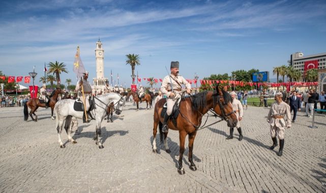 İzmir’in işgalden kurtuluşunun 101. yıldönümü kutlamaları kapsamında Konak Atatürk Meydanı’nda temsili bayrak töreni yapıldı. Törende İzmir’in kurtuluşunu canlandıran süvari birlikleri Hükümet Konağı’nın önüne geldi ve Yüzbaşı Şerafettin’i temsil eden bir asker göndere Türk bayrağı çekti.