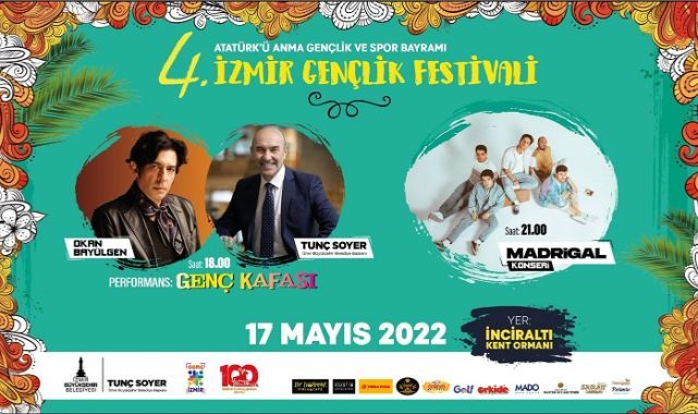 Büyükşehir Belediyesi, Milli Mücadele’nin 103’üncü yılının kutlanacağı 19 Mayıs Atatürk’ü Anma, Gençlik ve Spor Bayramı’nda Gençlik Festival’i düzenliyor. 17-21 Mayıs tarihleri arasında İnciraltı Kent Ormanı’ndaki festivalin ilk gününde saat 17.00’de İzmir Büyükşehir Belediye Başkanı Tunç Soyer, gençlik projelerini anlatacağı ve yeni projelerinin müjdesini vereceği bir tanıtım toplantısına ev sahipliği yapacak. Toplantının ardından 18.00’de ise Başkan Tunç Soyer, ünlü televizyoncu Okan Bayülgen’le gençlik buluşmasına katılacak. Kampın ilk gününde program 21.00’de Madrigal konseriyle devam edecek. Beş gün sürecek festival kapsamında 19 Mayıs 20.00’de ise Gündoğdu Meydanı’nda Teoman sahne alacak.