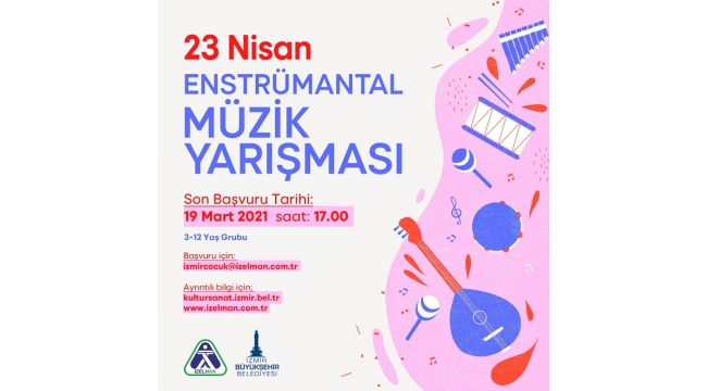 23 Nisan Ulusal Egemenlik ve Çocuk Bayramı Enstrümantal Müzik Yarışması düzenliyor. Kültür ve Sanat Dairesi Başkanlığı ile İZELMAN işbirliğinde düzenlenen yarışma, yeni nesillerde milli değer farkındalığı yaratmayı amaçlıyor. Çocuk Bayramı kutlamalarının çocuklar için daha akılda kalıcı ve katılımcı hale getirilmesinin de hedeflendiği müzik yarışmasına, 3-12 yaş aralığında çocuklar katılabilecek.