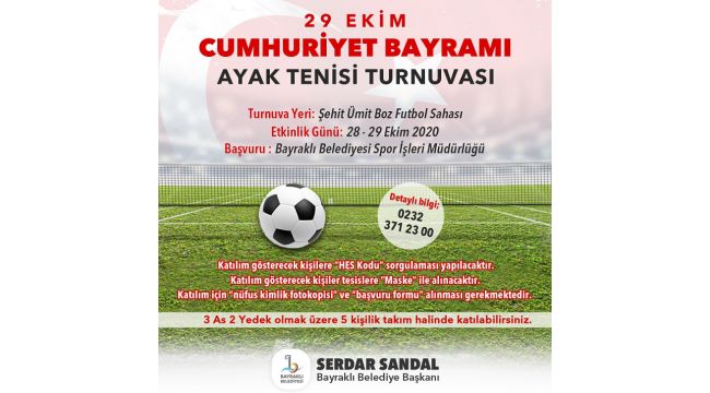 Bayraklı Belediyesi Spor İşleri Müdürlüğü, 29 ekim Cumhuriyet Bayramı dolayısıyla ayak tenisi Turnuvası düzenliyor. Dereceye girenlerin ödüllendirileceği ücretsiz etkinliğe, isteyen herkes 5'er kişilik kadrolarıyla katılabilecek.