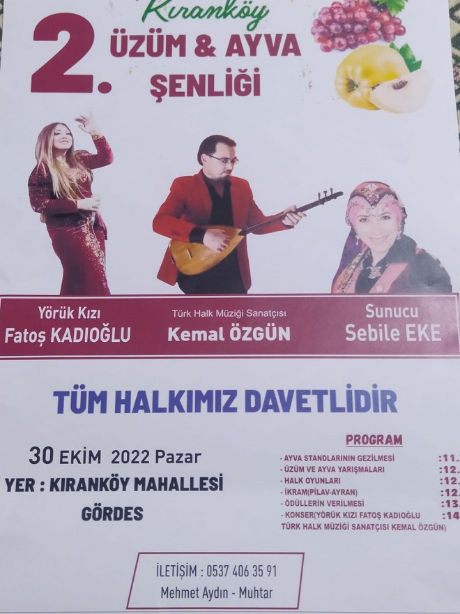 Manisa’nın Gördes ilçesine bağlı kırsal Kıranköy mahallesinde üzüm ve ayva şenliğinin ikincisi düzenleniyor. İlçe genelinde 1000 dönüm ayva ve 2 bin 500 dönüm civarı üzüm bağı bulunduğunu söyleyen Kıranköy Muhtarı Mehmet Aydın, “Geçen yıl ilkini düzenlediğimiz, Kıranköy Üzüm ve Ayva Şenliği büyük ilgi görmüştü. Son yıllarda üzüm ve ayva yetiştiriciliğinde büyük çıkış yapan mahallemize, şenlik düzenleyerek bayram yaşatmak istiyoruz.”dedi.