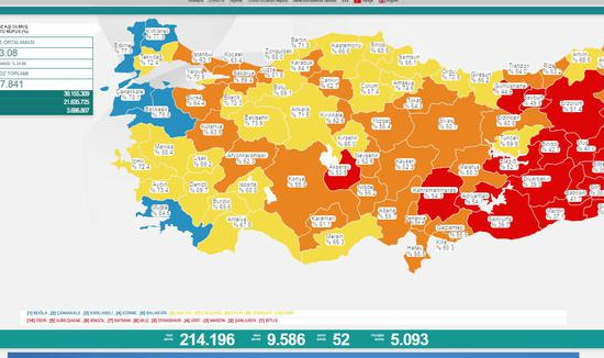 Tabloya göre, Türkiye'de son 24 saatte 214 bin 196 Kovid-19 testi yapıldı, 9 bin 586 kişinin testi pozitif çıktı, 52 kişi hayatını kaybetti, iyileşenlerin sayısı ise 5 bin 93 oldu.