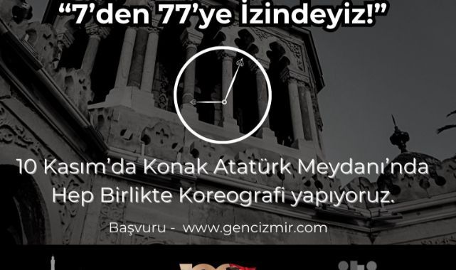 İzmir Büyükşehir Belediyesi, ulu önder Mustafa Kemal Atatürk’ün aramızdan ayrılışının 85. yıldönümünde Konak Atatürk Meydanı’nda 10 Kasım saat 09.05’te “7’den 77’ye İzindeyiz!” yazılı koreografi yapıyor. Katılmak isteyen İzmirliler gencizmir.com adresinden başvurabilir.