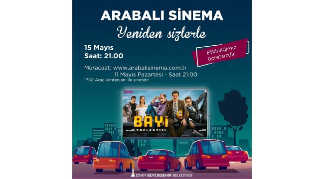 Bostanlı, İnciraltı Demokrasi Meydanı, Fuar İzmir, Bornova Aşık Veysel Rekreasyon Alanı Buz Pisti yanı, Buca ve Çiğli’de kurulacak dev perdede yönetmenliğini Bedran Güzel'in yaptığı "Bayi Toplantısı" filmi ücretsiz gösterilecek. Sinemaseverler arabalarından inmeden güvenli bir şekilde sinema keyfi yaşayacak. Başrollerini İbrahim Büyükak, Onur Buldu, Doğu Demirkol'un paylaştığı, mecburen katıldıkları bayi toplantısında kendilerini birbirinden eğlenceli maceraların içinde bulan üç beyaz eşya satıcısının hikayesini konu eden film 21.00'da başlayacak. Filmin sesi fm radyo frekansı üzerinden arabalardan dinlenebilecek. 2 saat sürecek film gösterimi sırasında izleyicilere patlamış mısır ve gazoz da ikram edilecek.