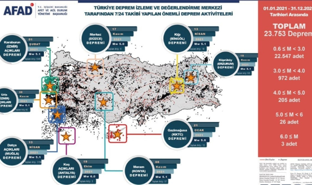 AFAD koordinasyonunda, geçen yıl 1760 olaya müdahale edildi. Düzce, Rize, Artvin selleri ile Batı Karadeniz sel afetlerinde toplam 14 bin 157 personel, 5 bin 26 araç görevlendirildi.Antalya, Muğla, Mersin ve Adana'da meydana gelen orman yangınlarına ise 22 bin 619 personelle müdahale edildi, 7 bin 935 araç ve iş makinesi kullanıldı.Ayrıca geçen yıl ülke genelinde 23 bin 753 deprem meydana geldi.