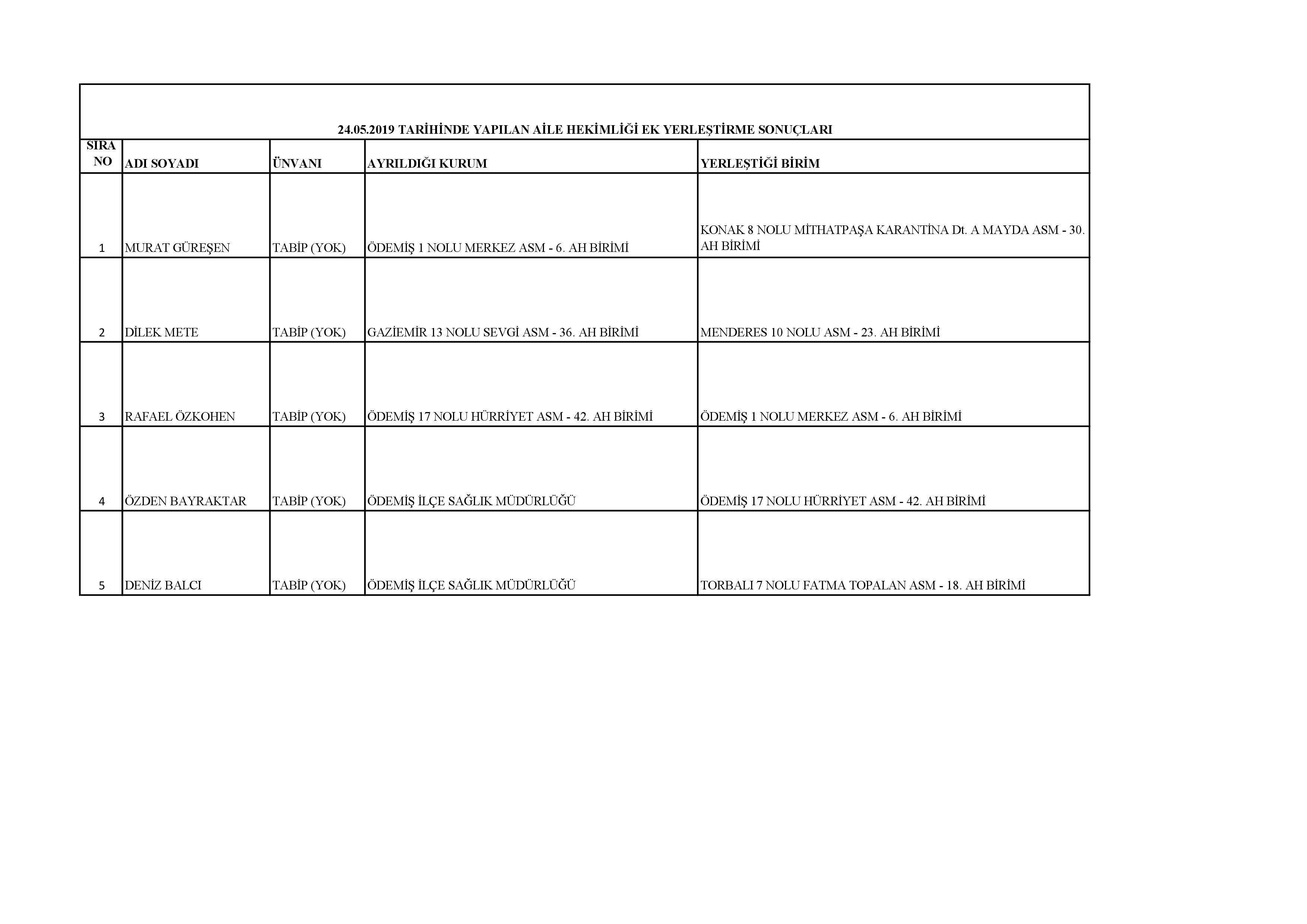 İzmir'de boş olan 6 aile hekimliği birimi için; 24/05/2019 tarihli Aile Hekimliği Tercih ve Yerleştirme İşlemi İzmir İl Sağlık Müdürlüğü ek hizmet binasında gerçekleştirildi. Boş olan 6 birimden, sistemdeki aile hekimlerinin yaptığı yer değişikliği dahil 5 birim tercih edildi.