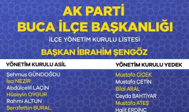 ak parti buca İlçe yeni Yönetim Kurulu, İbrahim Şengöz başkanlığında şu isimlerden oluşuyor: