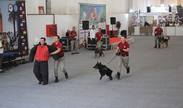 Birçok operasyonda ön saflarda polislerle birlikte yer alan görev köpekleri, bu kez Fuar İzmir’de sahneye çıktı. İzmir Emniyet Müdürlüğü bünyesindeki Köpek Eğitim Merkezi'nde (KEM) sevgi, sabır ve otorite ile harmanlanmış bir ortamda eğitimini tamamlayan görev köpekleri maharetlerini sergiledi. Mesailerinin tamamını sorumlu oldukları "arkadaşları" ile geçiren polis idarecilerin verdiği komutlar akıllı köpekler tarafından eksiksiz olarak yapıldı. Kötü niyetli kalabalığın dağıtılması, kişi ve araçların aranması, koklatılan bir cismin bulunması gösterinin önemli bölümlerini oluşturdu. Merkezde görevli narkotik dedektör köpek ile senaryo gereği durdurulan bir otomobilde arama yapıldı. Dedektör köpek, araca gizlenen uyuşturucu maddeyi kısa sürede bularak tepki verdi. Polise mukavemet eden silahlı şahısların etkisiz hale getirilmesi izleyenlerden dakikalarca alkış aldı. Program sonunda hayranlarıyla hatıra fotoğrafları çektiren polis memurları, “Bunlar bizim silah arkadaşlarımız, bunlarla beraber görev yapmaktayız. Ülkemiz ve insanlarımız için hizmet etmekteyiz. Bizim için çok değerliler”dedi.