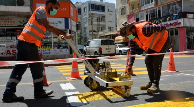 İzmir'de Aliağa Belediyesi, kent merkezinde araç ve yaya trafiğinin yoğun olduğu cadde ve sokaklarda yaya geçidi çizgilerini yeniliyor.