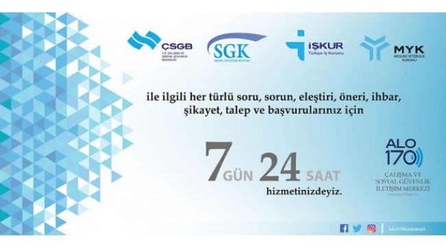 Aile, Çalışma ve Sosyal Hizmetler Bakanlığı İletişim Merkezi ALO 170, 10 farklı ilde bin 567 çalışanıyla 7/24 kesintisiz hizmet veriyor. Günlük ortalama 80 bin ile 100 bin arasında çağrının cevaplandığı merkezde; Aile, Çalışma ve Sosyal Hizmetler Bakanlığı, Sosyal Güvenlik Kurumu, İş-Kurumu ile Mesleki Yeterlilik Kurumu mevzuatları konusunda hizmetler veriliyor.