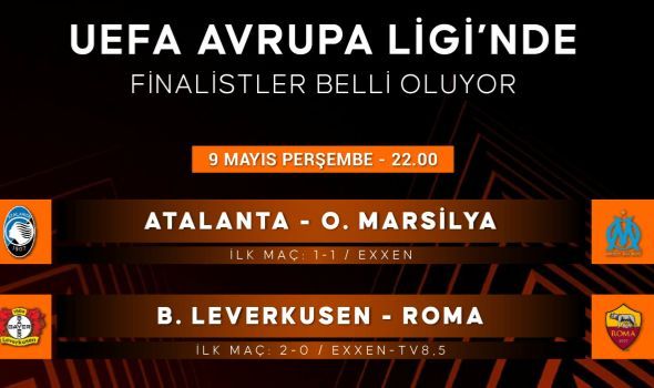 Avrupa futbolunun kulüp düzeyindeki iki numaralı turnuvasının yarı finalinde Atalanta-Olimpik Marsilya ve Bayer Leverkusen-Roma maçları oynanacak.İlk maçı 2-0 kazanan Almanya ekibi Bayer Leverkusen, İtalya'nın Roma takımını Leverkusen kentindeki BayArena'da oynanacak rövanşta ağırlayacak.İtalya temsilcisi Atalanta ise Fransa ekibi Olimpik Marsilya'yı 1-1 beraberlikle biten ilk maçın rövanşında Bergamo şehrindeki Gewiss Stadı'nda konuk edecek.İki karşılaşma da TSİ 22.00'de başlayacak. Bayer Leverkusen-Roma maçı TV8,5'tan, Atalanta-Olimpik Marsilya mücadelesi ise EXXEN'den naklen yayımlanacak.UEFA Avrupa Ligi final maçı, 22 Mayıs'ta İrlanda'nın başkenti Dublin'de yapılacak.