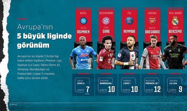İngiltere'de Arsenal, İspanya'da Real Madrid, İtalya'da Napoli, Almanya'da Bayern Münih, Fransa'da ise Paris Saint-Germain (PSG), puan tablosunun zirvesinde yer aldı.Premier Ligİngiltere Premier Lig'in 4. haftasında Fulham'ı 2-1 mağlup eden Arsenal, 4'te 4 yaparak liderlik koltuğunda kalmaya devam etti.Liverpool'dan Bournemouth karşısında 9 gollü rekor galibiyet geldi. Bournemouth'u 9-0 mağlup ederek ligde ilk galibiyetini alan Liverpool, puanını 5'e çıkardı.Bu arada Liverpool, Premier Lig tarihinin en farklı skor rekorunu egale etti. Daha önce Manchester United, 1995'te Ipswich Town ve 2021'de Southampton'a karşı, Leicester City ise 2019'da Southampton önünde 9 farklı galip geldi.Son şampiyon Manchester City, evinde Crystal Palace'ı 2-0 geriden gelerek 4-2 yendi. Bu sonuçla Manchester City, 10 puana yükselirken Crystal Palace 4 puanda kaldı.Diğer maçlarda ise Chelsea, Leicester City'yi 2-1, Brighton da Leeds United'ı 1-0 mağlup etti. Brentford ile Everton ise 1-1 berabere kaldı.Premier Lig'in 4. haftası sonunda 12 puanı bulunan Arsenal'ı, 10'ar puanlı Manchester City, Tottenham ve Brighton izledi.La Ligaİspanya 1. Futbol Ligi'nin (La Liga) 3. haftasında geçen sezonun şampiyonu Real Madrid, deplasmanda Espanyol'u 3-1 mağlup etti.Bu sonuçla ligde 3'te 3 yapan Real Madrid, 9 puanla lider durumda bulunuyor.Barcelona ise sahasında Valladolid'i 4-0 yendi. Ligdeki puanını 7'ye yükselten Barcelona, 2. sırada yer aldı.Katalan takımına bu sezon gelen 34 yaşındaki Polonyalı forvet Lewandowski, geçen hafta olduğu gibi bu hafta da rakip ağları 2 kez havalandırarak, ligdeki gol sayısını 4'e çıkardı.La Liga'nın 3. haftası sonunda lider Real Madrid ile aynı puandaki Real Betis averajla ikinci, 7 puanlı takımlardan Barcelona üçüncü ve Villarreal ise dördüncü sırada yer buldu.Serie Aİtalya Birinci Futbol Ligi'nin (Serie A) 3. haftasındaki Fiorentina-Napoli karşılaşması 0-0 tamamlandı.Haftaya puan tablosunun zirvesinde başlayan Napoli'nin, orta sıralardaki Fiorentina'ya konuk olduğu maçta gol sesi çıkmadı.Serie A'nın son şampiyonu Milan, sahasında Bologna'yı 2-0 yenerken, Juventus ile Roma 1-1 berabere kaldı. Roma'da milli futbolcu Zeki Çelik, 62. dakikada oyuna dahil oldu. Bu sonuçla Roma 7, Juventus 5 puana ulaştı.Inter'i ağırlayan Lazio, karşılaşmayı 3-1 kazandı. Inter'de milli futbolcu Hakan Çalhanoğlu 77. dakikada oyuna dahil oldu. Lazio, puanını 7'ye yükseltirken, Inter ise 6 puanda kaldı.Serie A'nın 3. haftasında puanını 7'ye yükselten Napoli, aynı puana sahip Milan, Lazio, Atalanta, Torino ve Roma'nın averajla önünde zirvede yer aldı.BundesligaAlmanya Birinci Futbol Ligi'nde (Bundesliga) Bayern Münih, sahasında Borussia Mönchengladbach ile 1-1 berabere kaldı.Bu sezon ilk defa puan kaybeden Bayern Münih, bu sonuçla puanını 10'a çıkardı. Borussia Mönchengladbach ise puanını 8'e yükseltti.Borussia Dortmund ise deplasmanda Hertha Berlin'i 1-0 yendi. Karşılaşmada milli futbolcu Salih Özcan, 90 dakika forma giydi ve Modeste'nin attığı golün asistini yaptı.Borussia Dortmund, bu sonuçla puanını 9'a çıkarırken, Hertha Berlin 1 puanda kaldı.Leipzig de sahasında Wolfsburg'u 2-0 yendi. Leipzig, bu sezon ilk galibiyetini alarak puanını 5'e çıkardı.Bundesliga'nın 4. haftasının ardından 10 puana sahip Bayern Münih'i, 10 puanlı Union Berlin, 7 puanlı Freiburg, Hoffenheim ve Borussia Dortmund takip etti.Ligue 1Fransa Birinci Futbol Ligi'nin (Ligue 1) 4. haftasında Paris Saint-Germain (PSG) ile Monaco 1-1 berabere kaldı.Haftaya kayıpsız lider başlayan PSG, puan tablosunun orta sıralarındaki Monaco ile berabere kalarak ilk puan kaybını yaşadı.Ligue 1'de 4. haftanın ardından son şampiyon PSG, puanını 10'a, Monaco ise 5'e yükseltti. PSG, aynı puana sahip Olimpik Marsilya ve Lens'in averajla önünde liderliğini sürdürdü.