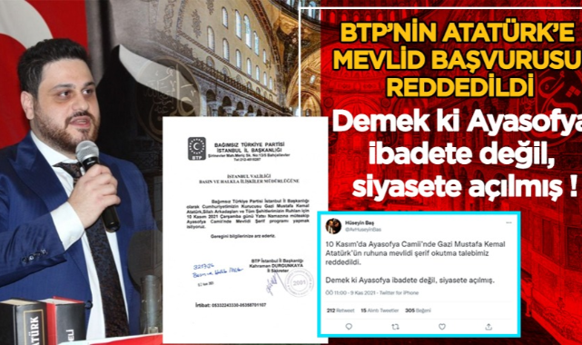 BTP lideri Hüseyin Baş, "Demek ki AYASOFYA ibadete değil, siyasete açılmış" ifadesi ile karara tepki gösterdi.Cumhuriyetimizin kurucusu Mustafa Kemal Atatürk ile ilgili dikkat çekici çıkışlar yapan Bağımsız Türkiye Partisi, son olarak 10 Kasım'da Ayasofya Camii'nde Atatürk için Mevlit okutmak istedi.BTP ilk başvuruyu İstanbul Müftülüğü'ne yaptı, ancak Müftülük, "Ayasofya bize değil, İstanbul Valiliği'ne bağlı" diyerek başvuru dilekçesini almadı.Bunun üzerine 2 Kasım'da İstanbul Valiliği’ne dilekçe sunan BTP İstanbul İl Başkanlığı, Atatürk, silah arkadaşları ve tüm şehitlerimiz için 10 Kasım’da Ayasofya Camii’nde Mevlidi Şerif programı için izin başvurusu yaptı.Beklenen cevap 10 Kasım'a 2 gün kala geldi.İstanbul Valiliği BTP İstanbul İl Başkanlığı'nın Ayasofya'da Atatürk için okutmak istediği Mevlidi Şerif'e izin vermedi.BTP liderinden dikkat çekici tepkiValiliğin ret kararına BTP Genel Başkanı Hüseyin Baş "Demek ki Ayasofya ibadete değil, siyasete açılmış" diyerek tepki gösterdi.Hüseyin Baş sosyal medya hesabından yaptığı açıklamada, "10 Kasım’da Ayasofya Camii’nde Gazi Mustafa Kemal Atatürk’ün ruhuna mevlidi şerif okutma talebimiz reddedildi. Demek ki Ayasofya ibadete değil, siyasete açılmış." ifadelerini kullandı.BTP liderinin açıklamasına büyük destek…BTP Liderinin bu açıklaması büyük yankı buldu.Sosyal medyada binlerce kullanıcı bu açıklamayı paylaşıp, tepkilerini dile getiren yorumlarda bulundular."Atatürk olmasaydı ne Ayasofya, ne İstanbul, ne de Türkiye olacaktı"BTP lideri Hüseyin Baş en son katıldığı partisinin Kilis il kongresinde yaptığı konuşmada şu ifadeleri kullanmıştı:"Yıkılmış bir devletten bir Cumhuriyet inşa eden Atatürk’ün, İstanbul’u fethiyle birlikte biz Ayasofya’ya kavuşmuş olduk. Eğer Atatürk olmasaydı ne Ayasofya olacaktı, ne İstanbul olacaktı ne de Türkiye olacaktı. Dolayısıyla Atatürk’ün işgalden kurtardığı İstanbul’daki en simge bir yapı olarak Ayasofya’yı ele alırsak… Ayasofya’da Atatürk’e hakaret, Atatürk’ü aşağılamak bir adet haline getirildi. Biz de Atatürk’ün, Türk milletinin evlatları olarak bundan çok büyük rahatsızlıklar duyduk, bunun önüne geçmemiz gerekiyordu. Çünkü bugün bırakın Ayasofya’yı, bu ülkede ibadet edilmesinin teminatını bize veren Gazi Mustafa Kemal Atatürk’tür.”
