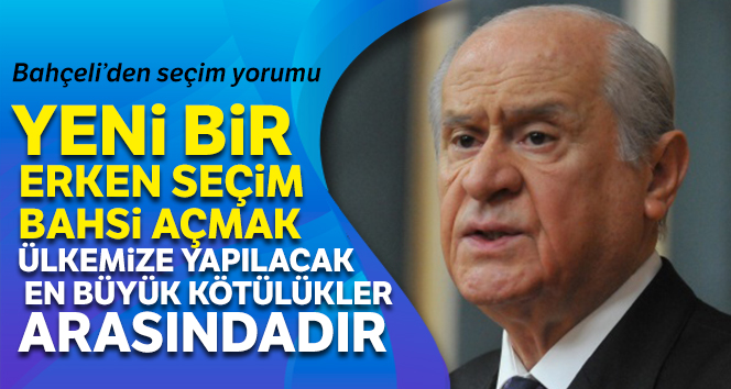 Milliyetçi Hareket Partisi (MHP) Genel Başkanı Devlet Bahçeli, İstanbul Büyükşehir Belediye Başkan Seçimi hakkında açıklamada bulundu. Bahçeli, “Yeni bir erken seçim bahsi açmak ülkemize yapılacak en büyük kötülükler arasındadır” dedi.