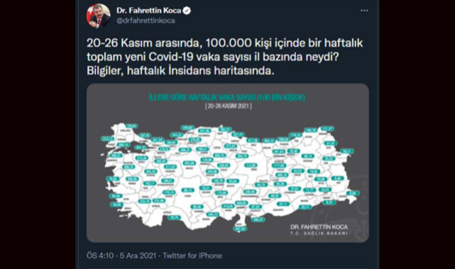 Sağlık Bakanı Fahrettin Koca'nın paylaştığı haftalık vaka sayısı haritasına göre, 100 bin kişide en çok vaka artışı Osmaniye, Adana, Mersin'de oldu.Sağlık Bakanı Fahrettin Koca, Twitter hesabından 20-26 Kasım'da illere göre her 100 bin kişide görülen Covid-19 vaka sayılarının güncellendiği haritayı paylaştı.Haritaya göre; İstanbul'da 100 bin kişide görülen vaka oranı 287,40, Ankara'da 202,88, İzmir'de 70,65 oldu.Vaka sayısı en çok artan iller ise Osmaniye, Adana, Mersin, Hatay, Kırklareli, Çanakkale, Eskişehir, Burdur, Bilecik ve Edirne oldu. Bu illerde vaka oranları Osmaniye 600,85, Adana 416,65, Mersin 345,74, Hatay 347,55, Kırklareli 379,83, Çanakkale 380,21, Eskişehir 311,53, Burdur 232,88, Bilecik 380,40 ve Edirne'de 212,13 olarak kayıtlara geçti.TRAKYA'DA VAKA SAYILARI YÜKSELDİSağlık Bakanı Fahrettin Koca'nın açıkladığı koronavirüs vaka tablosuna göre, Kırklareli, Edirne ve Tekirdağ'da vaka sayıları arttı. Kırklareli vaka sayısı artan 5'inci, Edirne ise 10'uncu il oldu.Sağlık Bakanı Fahrettin Koca, 20-26 Kasım tarihleri arasında illere göre her 100 bin kişide görülen Covid-19 vaka sayılarını açıkladı. Daha önce açıklanan tabloda, Kırklareli'nin 308,51 olan vaka sayısı 379,83'e, Edirne'nin 159,16 olan vaka sayısı 212,13'e, Tekirdağ'ın 262,61 olan vaka sayısı 288,14'e yükseldi.3 İL KIRMIZIYA BÜRÜNDÜBöylece Hayat Eve Sığar (HES) uygulamasındaki koronavirüs yoğunluk haritasına göre de 3 il kırmızıya büründü. En az iki doz aşı olmuş 18 yaş ve üstü nüfusta mavi iller arasındaki Kırklareli yüzde 83,9 ile Türkiye'de 5'inci sırada yer aldı. Tekirdağ'da ise aşılama oranı yüzde 81,5, Edirne'de de yüzde 82,0 oldu. ESKİŞEHİR VE BİLECİK VAKA SAYILARI EN ÇOK ARTAN 10 İL ARASINDASağlık Bakanlığı'nın açıkladığı haftalık koronavirüs risk haritasına göre, Eskişehir, Bilecik ve Kütahya'da vakalar arttı. Bir önceki haftaya göre en çok artış görülen 10 şehir arasında Eskişehir ve Bilecik de yer aldı.Sağlık Bakanı Fahrettin Koca, 20-26 Kasım'ı kapsayan haftalık koronavirüs risk haritasını açıkladı. 900 bin nüfuslu Eskişehir'de vaka sayısı, 100 bin kişide 253,14 seviyesinden 58,39 artışla 311,53'e yükseldi. 580 bin nüfusa sahip Kütahya'da da vaka sayısı, 100 bin kişide 218,49’dan 36,93 artışla 255,42’ye çıktı. Nüfusu 220 bin olan Bilecik'te ise 100 bin kişide vaka sayısı 325,53’ten 54,87 artışla 380,40 seviyesine çıktı. Önceki haftaya göre, vaka sayısında en çok artış görülen ilk 10 şehir; Eskişehir, Bilecik, Osmaniye, Adana, Mersin, Hatay, Kırklareli, Çanakkale, Burdur ve Edirne oldu.