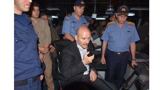 İZMİR (İHA) - Sahil Güvenlik Komutanlığının arama kurtarma gemisi TCSG Dost ile gece seyrine çıkan İçişleri Bakanı Süleyman Soylu, denize açılarak incelemelerde bulundu.