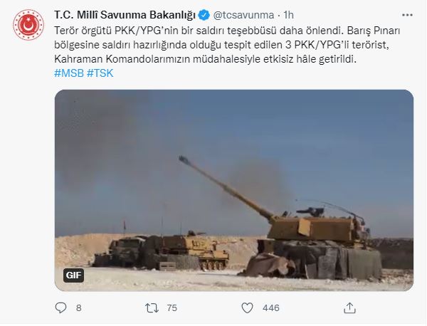 Bakanlıktan yapılan açıklamada şunlar kaydedildi:"Terör örgütü PKK/YPG'nin bir saldırı teşebbüsü daha önlendi. Barış Pınarı bölgesine saldırı hazırlığında olduğu tespit edilen 3 PKK/YPG'li terörist, kahraman komandolarımızın müdahalesiyle etkisiz hale getirildi."