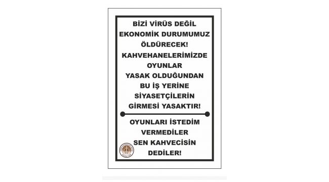Kahvehanelerin camına da “Bizi Virüs değil, Ekonomik durum öldürecek! Kahvehanelerimizde oyunlar yasak olduğundan bu iş yerine SİYASETÇİLERİN girmesi YASAKTIR! Oyunları istedim vermediler sen kahvecisin dediler.” diye afiş asacaklarını açıkladı.