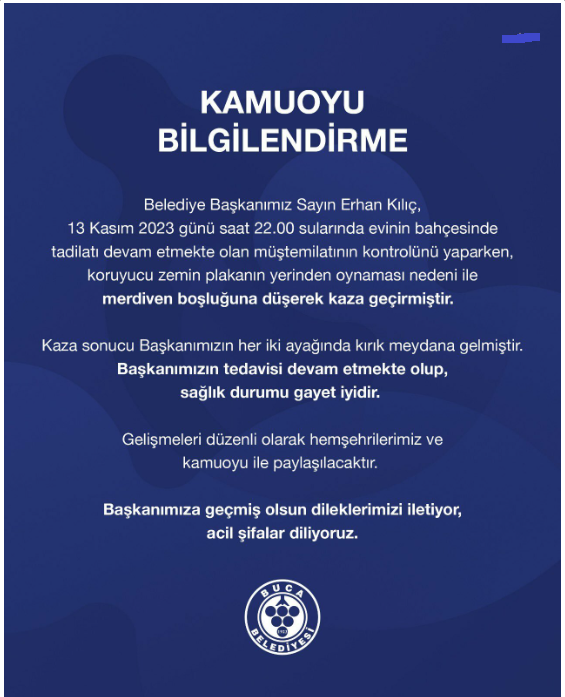 Buca Belediye Başkanı Erhan Kılıç'ın kaza geçirdiği öğrenildi. Edinilen bilgiye göre, Kılıç'ın merdivenden düşmesi sonucu 2 bacağı kırıldı.Kılıç'ın ameliyatta olduğu öğrenildi. Konu ile ilgili Buca Belediyesinden yazılı açıklama geldi.işte o açıklama:Belediye Başkanımız Sayın Erhan Kılıç, 13 Kasım 2023 günü saat 22.00 sularında evinin bahçesinde tadilatı devam etmekte olan müştemilatının kontrolünü yaparken, koruyucu zemin plakanın yerinden oynaması nedeni ile merdiven boşluğuna düşerek kaza geçirmiştir. Kaza sonucu Başkanımızın her iki bacağında da kırık meydana gelmiştir.Başkanımızın tedavisi devam etmekte olup , sağlık durumu gayet iyidir. Gelişmeleri düzenli olarak hemşehrilerimiz ve kamuoyu ile paylaşılacaktır. Başkanımıza geçmiş olsun dileklerimizi iletiyor, acil şifalar diliyoruz.