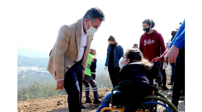 Bayraklı’nın daha yaşanabilir hale gelmesi ve gelecek nesillere daha yeşil bir Bayraklı bırakmak için çalışmalarını sürdüren Bayraklı Belediye Başkanı Serdar Sandal, özel gereksinimli çocuklar ve sporcularla beraber fidan dikti. Pandemi kuralları çerçevesinde bir araya gelen çocuklar, elleriyle çam fidanlarını toprakla buluşturmanın heyecanını yaşadı.