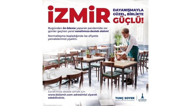 “Zorlukları beraber paylaşalım” diyerek İzmirlilere çağrıda bulunan İzmir Büyükşehir Belediye Başkanı Tunç Soyer “Koronavirüs salgınının başladığı Mart ayında ‘Biz Varız’ sloganıyla Türkiye'ye örnek olan İzmir dayanışmasını başlattık. Bu dayanışma ruhuyla depremde de İzmirli yurttaşlarımınız yarasını hep birlikte sardık. Biz imece kültürünü atalarımızdan öğrendik. Bu kadim kültürün temelinde zaten dayanışma ruhu var. Şimdi bir kez daha esnafımız için harekete geçmemiz gerekiyor. Birbirimize ne kadar sahip çıkarsak o kadar iyi. Ön ödeme yaparak esnafımıza destek olalım. Sağlıklı günlerde mutlu sofralarda buluşalım” diye konuştu.