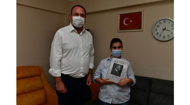 Çiğli Belediye Başkanı Utku Gümrükçü, evinde ziyaret ettiği Dokuz Eylül Üniversitesi Eğitim Fakültesi İngilizce Öğretmenliği Bölümünü kazanan görme engelli Mine Yılmaz’ı tebrik edip, braille alfabesiyle hazırlanan Nutuk ve beyaz baston hediye etti.