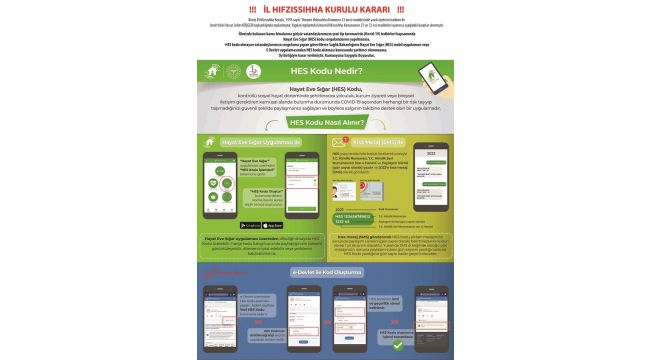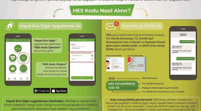 Hayat Eve Sığar (HES) kodu, ulaşım ya da ziyaret gibi durumlarda, vatandaşın COVİD-19 hastalığı açısından herhangi bir risk taşıyıp taşımadığını gösteren bir koddur. HES kodu 3 şekilde alınır:
