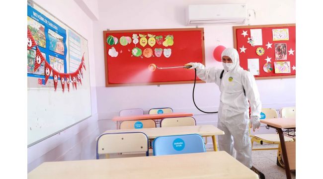 Bayraklı Belediyesi Temizlik İşleri Müdürlüğü ekipleri pandemi sürecinde gerçekleştirilen sınavlarda düzenli olarak temizlenen okulları yeni eğitim dönemi öncesi de hazır hale getirdi. İlçedeki okulları en ince ayrıntısına kadar dezenfekte eden belediye ekipleri; sınıf, tuvalet, kütüphane ve bahçe gibi ortak kullanım alanlarını temizledi.
