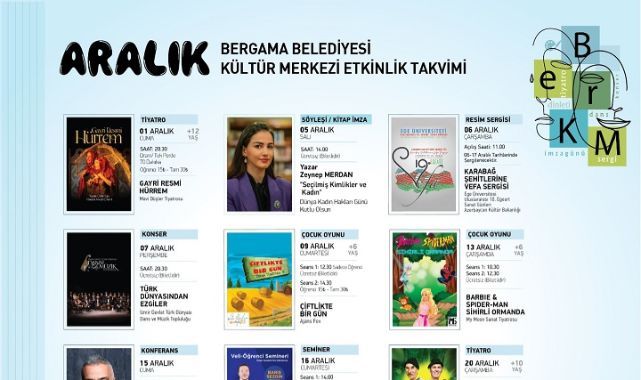 Bergama Belediyesi, vatandaşlarını Aralık ayında da kültür – sanat etkinlikleriyle buluşturuyor. Tiyatro, konser, sergi, konferans, söyleşi, ve seminerlerin olacağı Aralık ayının programı da netleşti.