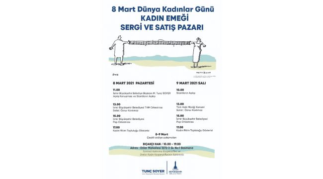 Pandemi önlemleri alınarak açılacak Kadın Emeği Sergi ve Satış Pazarı 8 Mart Pazartesi saat 11.00’de İzmir Büyükşehir Belediye Başkanı Tunç Soyer’in açılış konuşmasıyla başlayacak. 32 kooperatifin standının bulunacağı Bıçakçı Han’da tarihi Basmane bölgesinin kültürel özelliklerini yansıtan ürünler ve atölye çalışmaları da olacak. Bölgede bulunan müzik aletleri üreticilerinin uygulamalı sergi ile katılacağı etkinlikte Halil İbrahim Efendi tarafından 1930 yılında kurulan ve o zamandan bugüne üç kuşaktır Basmane'de faaliyetini sürdüren ÖZTAT tatlıcısı da yer alacak. Bıçakçı Han’da iki gün boyunca Öznur Korkmaz’ın solist olarak katıldığı İzmir Büyükşehir Belediyesi THM Orkestrası, Belediye Pop Orkestrası ve Kadın Ritim Topluluğu Gösterisi ile Emir Sultan Mahallesi kadınlarının ritim gösterisi de olacak. 9 Mart Salı günü ise 10.00-19.00 arası stantlar açık olacak.