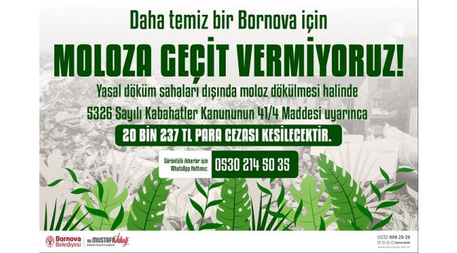 Bornova Belediyesi Zabıta Müdürlüğü ekipleri, ‘Daha temiz bir Bornova için moloza geçit vermiyoruz’ sloganıyla başlatılan çevre seferberliği kapsamında kenti sokak sokak denetleyerek yasal döküm alanlarının dışında kalan alanlara moloz dökenler hakkında tutuyor. Gerekli uyarıların yapılarak 5326 Sayılı Kabahatler Kanunu’nun 41/4 Maddesi uyarınca üst sınır olan 20 bin 237 TL ceza kesiliyor.