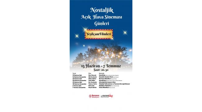 Bornova'nın farklı mahallerine kurulacak platformlarda yapılacak olan Nostaljik Açıkhava Sineması Günleri 15 Haziran ve 7 Temmuz tarihleri arasında kalan Salı ve Çarşamba günleri gerçekleşecek. Gösterimlerde Mavi Boncuk, Süt Kardeşler, Gülen Gözler, Tatlı Dillim, Sev Kardeşim, Yalancı Yarim, Bizim Aile ve Neşeli Günler filmleri izleyici ile buluşacak. Ayrıca saat 20:30’da başlayacak olan gösterimlerde film keyfinin yanında leblebi ve gazoz da ikram edilecek.