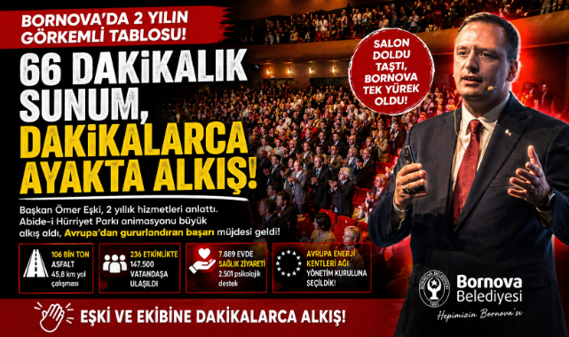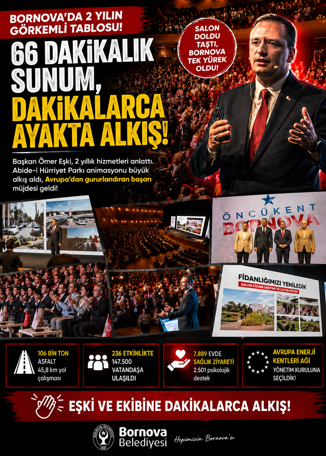 Bornova Belediye Başkanı Ömer Eşki, sahnede gerçekleştirdiği 66 dakikalık sunumda göreve geldiği günden bu yana hayata geçirilen projeleri ve yatırımları detaylarıyla anlattı. “Kuzey Yıldızı” mottosuyla yola çıktıklarını belirten Eşki, Bornova’yı kentsel, yeşil ve dijital dönüşüm ekseninde geleceğe hazırladıklarını vurguladı.