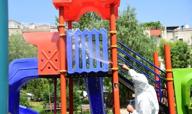 Bornova Belediyesi, yoğun eğitim maratonunun ardından yaz tatiline giren çocukların parklarda güvenle oynayıp vakit geçirebilmeleri için oyun gruplarını ve kent mobilyalarını dezenfekte etti.