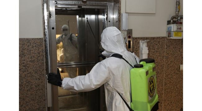 Apartmanlarında Covid 19 testi pozitif çıkan vaka görülüp Belediyeye yazılı olarak başvuruda bulunan vatandaşların adreslerine giden ekipler, genel kullanım alanlarını baştan aşağı dezenfekte ediyor. Özel giysili dezenfeksiyon ekipleri, kapı girişlerinden merdivenlere, asansörlerden çocuk oyun alanlarına kadar tüm ortak kullanım alanlarını ücretsiz olarak detaylı bir şekilde ilaçlayarak virüsten arındırıyor.