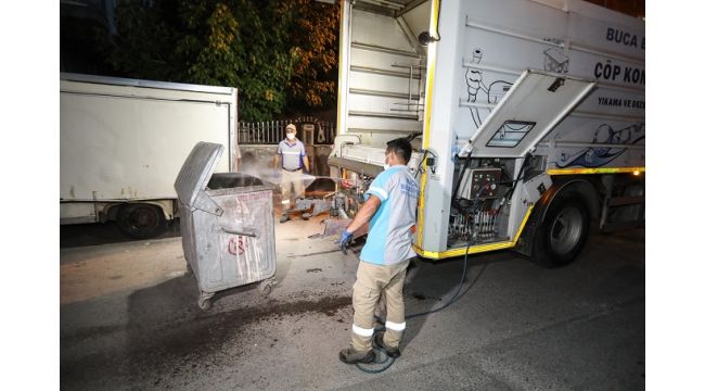 Gün boyu kent temizliği için sokak sokak alın teri döken buca belediyesi Temizlik İşleri Müdürlüğü ekipleri, akşam trafiğin rahatlamasıyla birlikte çöp konteynerlerindeki dezenfekte çalışmalarına hız kattı.