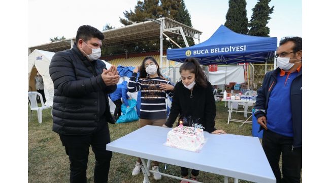 Buca Stadyumu ve Şirinyer Hipodromu’nda kurulan çadır kentleri ziyaret eden Başkan Kılıç, 14 yaşına basan Damla Melisa Başıbüyük’e doğum günü sürprizi yaptı. Damla’yla birlikte pasta kesen Kılıç, çadır kentteki tüm çocuklara hediyeler dağıtarak sağlıklı ve mutlu bir ömür diledi. Yaşadığı sürprizin etkisiyle mutluluğunu gizleyemeyen Damla Başıbüyük, “Çok duygulandım. Evde kalamadığımız için buraya geldik. Herkes doğum günümü kutladı. Buradaki herkes bize çok iyi davranıyor, hiçbir şeyimizi eksik etmiyorlar. Çok mutluyum başkanımız benim için buraya kadar geldi çok teşekkür ederim” diye konuştu.