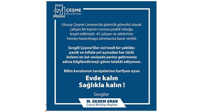 Çeşme Belediye Başkanı Ekrem Oran, Çeşme Gümrük Müdürlüğünde görevli bir çalışanda korona virüs tespit edildiğini belirterek, "45 çalışan ve ailelerinin hemen karantinaya alınmasına karar verildi" dedi.