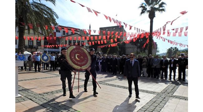 Cumhuriyet Meydanı'ndaki törene; Çeşme Kaymakamı Hacı Mehmet Kara, Garnizon Komutan Vekili Personel Teğmen Ozan Aziz Dilber, Belediye Başkanı Ekrem Oran, Çeşme Cumhuriyet Başsavcısı Aşkın Yeğin, İlçe Jandarma Komutanı Yarbay Emin Yılmaz, Çeşme İlçe Emniyet Müdürü Gürcan Alev, siyasi partilerin ilçe başkanları, sivil toplum örgütleri ve çok sayıda vatandaş katıldı.