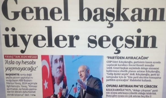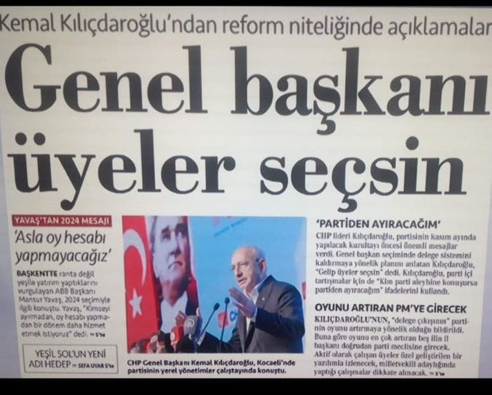 CHP Genel Başkanı Kemal Kılıçdaroğlu, Kocaeli'nin Kartepe ilçesindeki bir otelde düzenlenen Yerel Yönetimler Marmara Bölge Toplantısı'nda konuşmuş, "Delege sisteminden hepiniz şikayet ediyorsunuz arkadaşlar, delege sistemini kaldıracağız. Düzenli aidat ödeyenler, kendi milletvekillerini, belediye başkanlarını, il başkanlarını kendileri seçecek. Partiyle aidiyeti olan, her ay aidatını yatırıyorsan sorun yok, milletvekilin seç ama '5 bin kişiyi üye yap, ondan sonra gel milletvekilini seç' dediğiniz zaman mesele başka yerlere sapıyor. Dolayısıyla partiyle güçlü aidiyetin yolu aidat, ödüyorsa mesele yok. Gerçekten sağlık bir ön seçim istiyorsanız, düzenli aidat ödeyenler gelsin, milletvekilini, belediye ve il genel meclis üyesini seçsin" demişti.