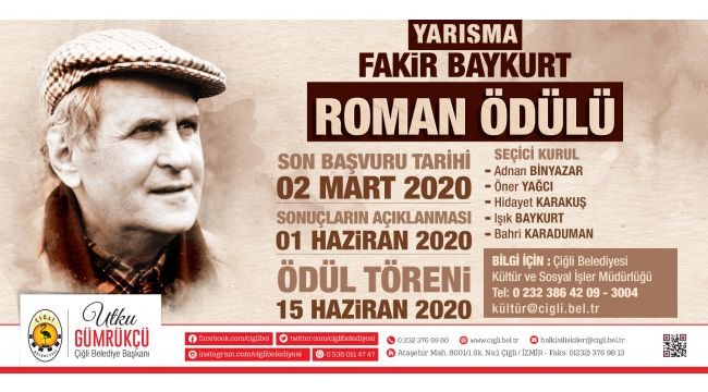 Kültür sanat alanında önemli işlere imza atan Çiğli Belediyesi, okuma alışkanlığı konusunda farkındalık yaratmak ve edebiyata toplumsal gerçekliği yansıtan yeni eserler kazandırmak amacıyla “Çiğli Belediyesi Fakir Baykurt Roman Yarışması” düzenliyor.