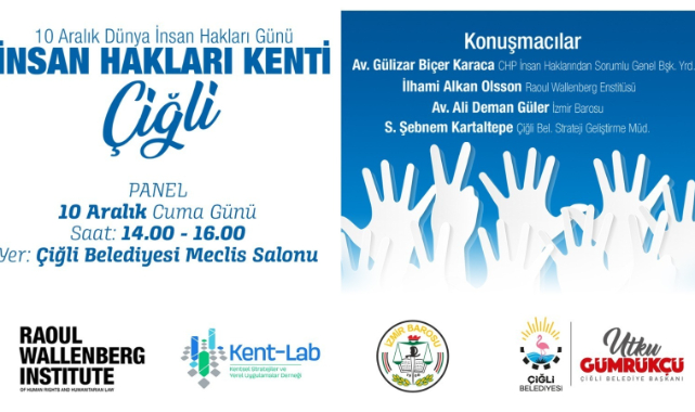 Çigli Belediyesi'nin öncülüğünde Raoul Wallenberg Enstitüsü, İzmir Barosu ve Kentsel Stratejiler ve Yerel Uygulamalar Derneği'nin katkılarıyla düzenlenecek "İnsan Hakları Kenti Çiğli" paneli, 10 Aralık Cuma günü (yarın) saat 14:00'de Çiğli Belediyesi Meclis Salonu'nda gerçekleştirilecek. Panele, CHP İnsan Haklarından Sorumlu Genel Başkan Yardımcısı Av. Gülizar Biçer Karaca, Raoul Wallenberg Enstitüsü sorumlusu İlhami Alkan Olsson, İzmir Barosundan Av. Ali Deman Güler ve Çiğli Belediyesi Strateji Geliştirme Müdürü Şebnem Kartaltepe konuşmacı olarak katılacak.