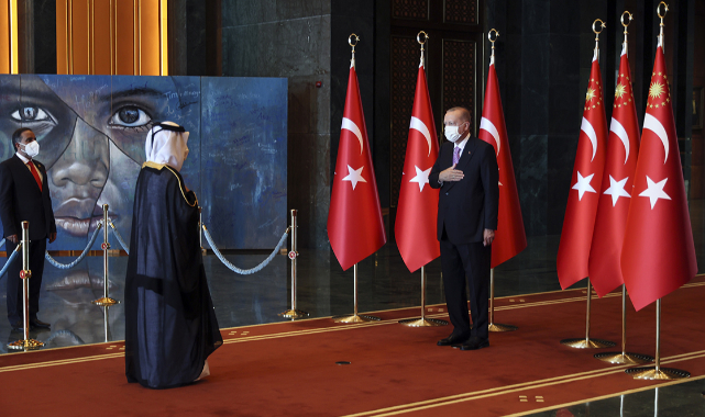 Erdoğan, tebrikleri, 23-24 Mayıs 2016 tarihlerinde İstanbul'da düzenlenen Dünya İnsani Zirvesi için özel resmedilen "Mülteci Çocuk" temalı tablonun önünde kabul etti.Tören, Başkentte görevli çeşitli rütbelerden askeri personelin Cumhurbaşkanı Erdoğan'a tebriklerini sunmasıyla sona erdi.Salgın nedeniyle maske takan katılımcılar, sosyal mesafe kuralına uyarak Cumhurbaşkanı Erdoğan ile uzaktan selamlaştı.