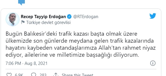 Cumhurbaşkanı Recep Tayyip Erdoğan, bugün Balıkesir'de meydana gelen ve 15 kişinin vefat ettiği trafik kazası nedeniyle başsağlığı mesajı yayımladı.Erdoğan, Twitter hesabından yaptığı paylaşımda, "Bugün Balıkesir'deki trafik kazası başta olmak üzere ülkemizde son günlerde meydana gelen trafik kazalarında hayatını kaybeden vatandaşlarımıza Allah'tan rahmet niyaz ediyor, ailelerine ve milletimize başsağlığı diliyorum. Devletimiz, yüreğimizi yakan bu hadiselerle ilgili soruşturmalarını titizlikle ve tüm boyutlarıyla sürdürmektedir. Cumhurbaşkanı olarak bu süreçlerin yakından takipçisi olmaya devam edeceğim." ifadelerini kullandı.