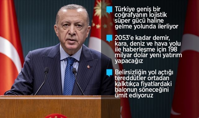 Erdoğan, 2053 ve 2071 vizyonlarını kendilerinden sonraki nesillere emanet edeceklerini söylediklerini hatırlattı.Cumhurbaşkanı Erdoğan, 2023'ün eşiğinde olduklarını, dolayısıyla bir sonraki vizyon eşikleri olan 2053'e yönelik hazırlıklarını hızlandırdıklarını belirterek, Birleşmiş Milletler İklim Değişikliği Konferansı'na sundukları katkı beyanıyla 2053 vizyonunun ilk somut hedefini ilan ettiklerini bildirdi.Bugün de İstanbul'un fethinin 600'üncü yıl dönümüne atfettikleri vizyonlarının önemli unsurlarından biri olacağına inandıkları 2053 Ulaştırma ve Lojistik Ana Planı'nı paylaşmak istediğini dile getiren Erdoğan, "Ülkemizin merkezinde bulunduğu yükselen Avrupa-Asya-Afrika ticaret üçgeni bizim için özellikle ulaştırma alanında büyük fırsatlar barındırıyor. Bugün 12 milyar ton olarak gerçekleşen dünya ticaret hacminin 2030 yılında 25 milyar tona, 2050 yılında 95 milyar tona ulaşması bekleniyor. Birleşmiş Milletler halen yüzde 50'si kentte yaşayan dünya nüfusu için bu oranın 2050 yılında yüzde 70'e çıkacağına işaret ediyor." diye konuştu.Dünyada ulaşıma yönelik talebin 2050 yılında iki katına çıkacağının anlaşıldığını söyleyen Erdoğan, "Küresel ticaretteki bu gelişmelere bakan vicdan sahibi herkes ülkemizin ulaştırma alanında son 20 yılda attığı adımların ne kadar önemli ve isabetli olduğunu kabul edecektir. Türkiye, Londra'dan Pekin'e, Sibirya'dan Güney Afrika'ya uzanan geniş bir coğrafyanın lojistik süper gücü haline gelme yolunda ilerlemektedir. Nitekim diğer ülkeler de ortaya çıkacak potansiyelden mümkün olan en yüksek payı almak için yatırımlarına hız vermeye başlamıştır." dedi.ABD'nin 2 trilyon dolarlık, Çin'in ise 559 milyar dolarlık altyapı yatırımları planladıklarının bilindiğini dile getiren Erdoğan, Türkiye'nin ise 2003 yılından 2021 yılı sonuna kadar 5 ana sektörde yaptığı 172 milyar dolarlık yatırımla bu konuda şimdiden oldukça mesafe katetmiş bir ülke olduğuna işaret etti.Temel önceliklerinin hep ekonominin üretim gücünü desteklemek olduğunu, yaptıkları yatırımlar sayesinde Türkiye'nin üretimini 1 trilyon doların üzerinde arttırmayı başardığını vurgulayan Cumhurbaşkanı Erdoğan, "Bu yatırımlarla yarısı da yeni olmak üzere 18 milyona yakın insanımızın istihdamını sağlayan ekonomik sonuçlar ürettik. Yine bu yatırımlarla milli gelirimize 520 milyar dolardan fazla katkı sunduk. Yarına hazırlanırken odak noktamıza insan, veri ve yük hareketliliğini yerleştirdik. Bu unsurları lojistik, mobilite, dijitalleşme ekseninde yeni ulaşım yaklaşım ve uygulamalarıyla birlikte ele alarak adımlarımızı atıyoruz. Akıllı otoyolların inşası bu uygulamalardan biridir." dedi.Ulaştırma ve Lojistik Ana Planı'nı veriye dayalı, ortak aklı önemseyen, topluma kulak veren bir anlayışla hazırladıklarını belirten Erdoğan, öncelikle güncel sosyo-demografik arazi kullanımı, ulaştırma sistemleri, altyapı ve turizm verilerine göre bir ihtiyaç analizi yaptıklarını ifade etti.Yük ve yolcu taşımacılığında emisyon salınımını azaltma hedefli, çevreci ve akıllı ulaşım sistemlerinin öne çıktığı senaryolar geliştirdiklerini söyleyen Erdoğan, "Sürdürülebilir senaryoda demir yolu yatırımlarımız artık ön plana çıkmıştır. Esasen yıllarca kaderine terk edilmiş demir yollarımızı zaten önemli ölçüde yeniden canlandırılmıştık. Mevcutların tamamını yenilediğimiz demir yolu hat uzunluğumuzu 10 bin 959 kilometreden 13 bin 22 kilometreye çıkardık. Hedefimiz bu rakamı 2053'te 28 bin 590 kilometreye taşımaktır." diye konuştu.Bunun için Ulaştırma ve Lojistik Ana Planı'nda demir yollarına özel bir yer verdiklerine dikkati çeken Erdoğan, şöyle devam etti:"Demir yollarının yolcu taşımacılığındaki payını yüzde 1'den Avrupa ortalamasının da üzeri olan yüzde 6,2'ye çıkartmakta kararlıyız. Bu da halen 19,5 milyon olan demir yolu yolcu sayımızın 2035 yılında 145 milyona, 2053'te ise 270 milyona ulaşması demektir. Yük taşımacılığımızın yüzde 4'e denk gelen 38 milyon tonu demir yoluyla gerçekleştirilmektedir. Amacımız 2053 yılında 440 milyon ton yükün demir yolu ile taşınmasını sağlayarak yaklaşık yüzde 22 seviyesine ulaşmaktır. Yurt dışı yük taşımacılığında da demir yolunun payını 10 kat artırmayı planlıyoruz. Hızlı tren hatlarını 2053 yılına kadar yaygınlaştırarak bu sistemle birbirine bağlı il sayımızı 8'den 52'ye çıkartacağız. Yolcu ve yük taşımacılığında kara yolu payının azaltılması, ulaşımdan kaynaklı karbon emisyonunun düşürülmesine de ciddi katkılar sağlayacaktır."Cumhurbaşkanı Erdoğan, yeni yatırımlarla kara yolu hizmet düzeyini de en üst seviyeye çekerek daha kesintisiz ve konforlu bir ulaşım tesis edeceklerini belirtti ve "Son 20 yılda bölünmüş yol ağımızı 6 bin 100 kilometreden 28 bin 650 kilometreye, otoyol ağımızı 1714 kilometreden 3 bin 633 kilometreye zaten bildiğiniz gibi çıkarmıştık. Hedefimiz, 2053'e geldiğimizde bölünmüş yol ağımızı 38 bin kilometreye, otoyol ağımızı ise 8 bin 325 kilometreye yükseltmektir." dedi.Limanların hem taşımacılık modlarının entegre edilmesi hem de uluslararası ulaşım koridorlarını özellikle birbirine bağlamak bakımından giderek daha da önem kazandığına dikkati çeken Erdoğan, "Önümüzdeki yıl limanlarımızdan 255 milyon tona yakın yük taşıması yapılacağı öngörülürken bu rakamın 2053 yılı için yaklaşık 421 milyon ton olması planlanmaktadır. Bu amaçla halen 217 olan liman tesisi sayımız 2053 yılında 255'e çıkartılacaktır. Kanal İstanbul Projesi ise İstanbul Boğazı'nda yaşanan gemi trafiğinin azaltılması ve ülkemizin jeopolitik konumundan 
