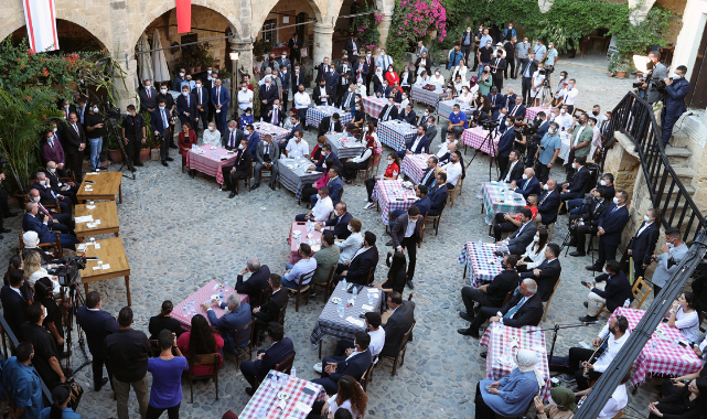 "Hellim peyniri gelmiyor dersek ayıp olur. Şu anda malum Kıbrıs'ın en güçlü kalemlerinden bir tanesi hellim peyniri. Tabii bizim aklımıza 74 geliyor. Çünkü 1974, o mücadele de o savaş da çocukluğumuzun en hareketli çağlarıydı ve buralardaki zafere giden o yolda Doktor Fazıl Küçük, Rauf Denktaş, öbür tarafta Başbakan merhum Ecevit, Başbakan Yardımcısı Erbakan ve bunlarla birlikte milletimizin verdiği mücadele unutulur gibi değildi. Verilen bu mücadele neticesinde de hamdolsun, bu zalim diyeceğim artık, Yunanların elinden kurtarılmış oldu. Bu mücadele ile birlikte adeta dünyada bize karşı Haçlı Seferi zihniyetini yeniden ortaya koymak isteyenlere Türkler olarak büyük bir ders vermiş olduk. O günden aklımda kalan en önemli başlık nedir diye sorarsanız onu da söyleyeyim. Beşparmak Dağları'dır. Şimdi de inşallah yapacağımız külliyeyi de Beşparmak Dağları'na sırtımızı dayayarak, böyle bir yerde yapmayı planladık Sayın Cumhurbaşkanı ile beraber."