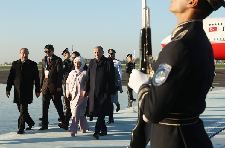 ,Cumhurbaşkanı Erdoğan ile eşi Emine Erdoğan, Gençlik ve Spor Bakanı Mehmet Muharrem Kasapoğlu, Kültür ve Turizm Bakanı Mehmet Nuri Ersoy, Milli Eğitim Bakanı Mahmut Özer, Milli Savunma Bakanı Hulusi Akar, Ticaret Bakanı Mehmet Muş, Ulaştırma ve Altyapı Bakanı Adil Karaismailoğlu, Cumhurbaşkanlığı İletişim Başkanı Fahrettin Altun ve Cumhurbaşkanlığı Sözcüsü İbrahim Kalın da Semerkant'a geldi.Cumhurbaşkanı Erdoğan, Özbekistan Cumhurbaşkanı Şevket Mirziyoyev'in davetine icabetle "Türk Medeniyeti için Yeni Dönem: Ortak Kalkınma ve Refaha Doğru" temasıyla düzenlenen Türk Devletleri Teşkilatı 9'uncu Zirvesi'ne katılacak.Zirvede teşkilatın 20 yıllık yol haritasını oluşturan vizyon belgesinin ilk 5 yıllık uygulama kılavuzunu teşkil edecek önemli kararlar alınacak, dönem başkanlığı Türkiye'den Özbekistan'a devredilecek.