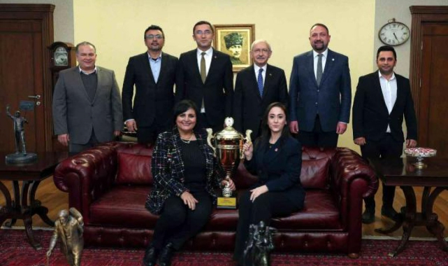 İzmir Çiğli Belediye Başkanı Utku Gümrükçü, Çiğli Belediyesi yelken takımının kazandığı Cumhurbaşkanlığı Kupasını CHP Genel Başkanı Kemal Kılıçdaroğlu'na takdim etti.