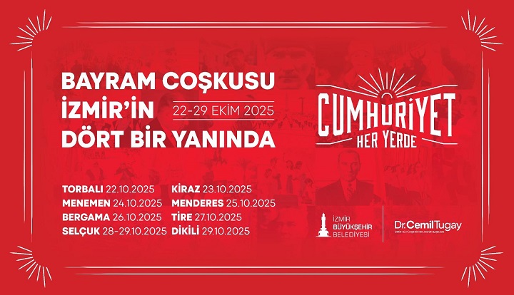 İzmir Büyükşehir Belediyesi, Cumhuriyet Bayramı’nın 102’nci yıl kutlamaları kapsamında bu yıl da “Cumhuriyet Her Yerde” sloganıyla İzmir’in dört bir yanında etkinlikler düzenleyecek. İzmir Büyükşehir Belediye Başkanı Dr. Cemil Tugay, 22-29 Ekim tarihleri arasında etkinliklerin Torbalı, Menemen, Bergama, Selçuk, Kiraz, Menderes, Tire ve Dikili’de düzenleneceğini belirterek tüm yurttaşları bu coşkuya ortak olmaya davet etti.